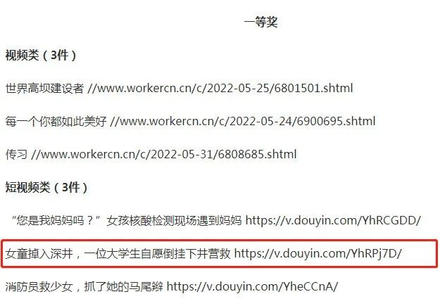 近日,2022“勞動創(chuàng)造幸福 實干鑄就偉業(yè)”攝影、短視頻評選活動獲獎名單公布,山西消防抖音賬號短視頻作品《女童掉入深井,大學(xué)生自愿倒掛下井營救》榮獲短視頻類一等獎。這是繼山西消防《主動消防進萬家》主題剪紙作品榮獲“2022年消防主題文創(chuàng)作品”一等獎之后,宣傳工作取得的又一重大榮譽。