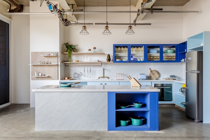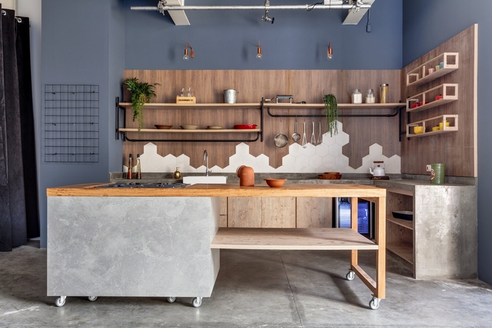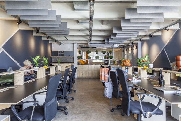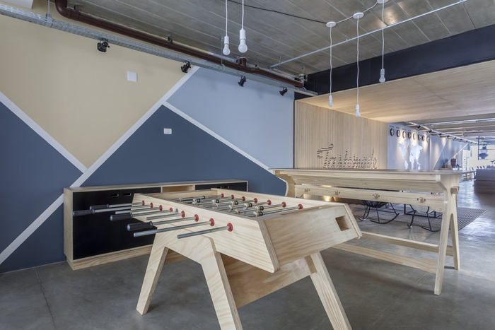 空間的照明已經(jīng)很明顯。它由帶聚光燈的穿孔電纜槽組成。決定沒(méi)有石膏襯里,但在桌子上做了一個(gè)木制襯里,作為聲音打擊器,以改善工作站的聲音效果。地板上還有一個(gè)會(huì)議室和休閑空間,還有一張用膠合板制成的足球桌。#辦公室裝修設(shè)計(jì)#