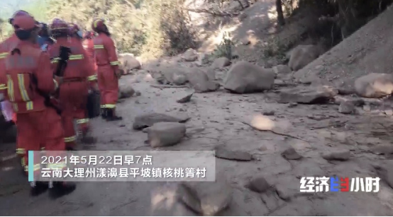 云南省楚雄消防救援支隊作為增援力量,于5月22日凌晨兩點達到漾濞縣震區(qū),7點52分,救援隊伍距離核桃箐村還有3公里的時候,遭遇到地震塌方路段。其中一處道路完全被塌方的石頭和樹木截斷,救援人員的車輛無法前行。