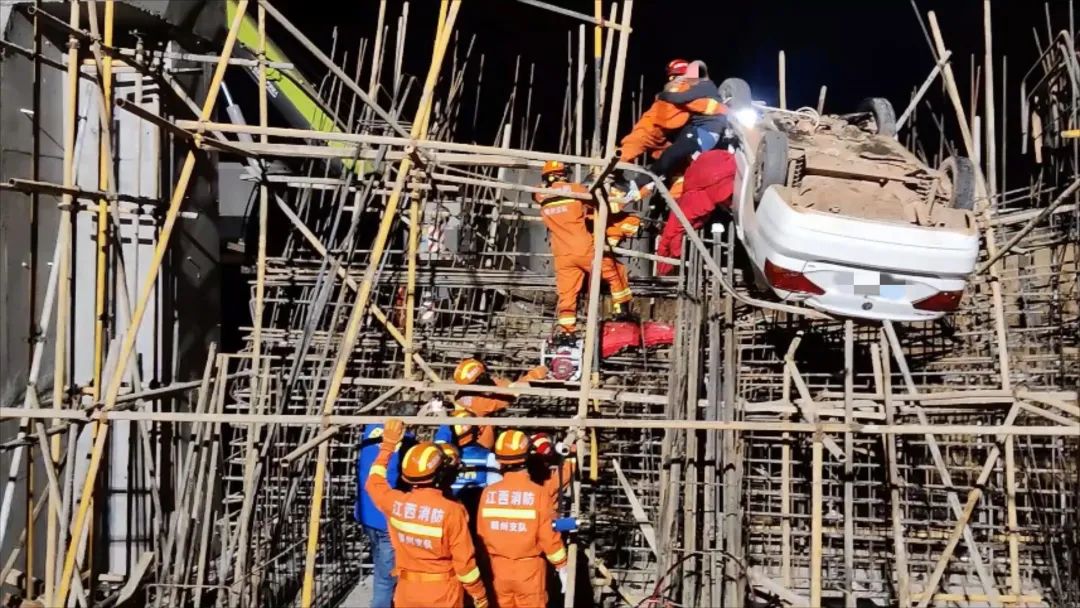 12月11日22時(shí)許,江西贛州蓉江新區(qū),一輛轎車沖出護(hù)欄并翻車“四腳朝天”卡在鋼筋架上。