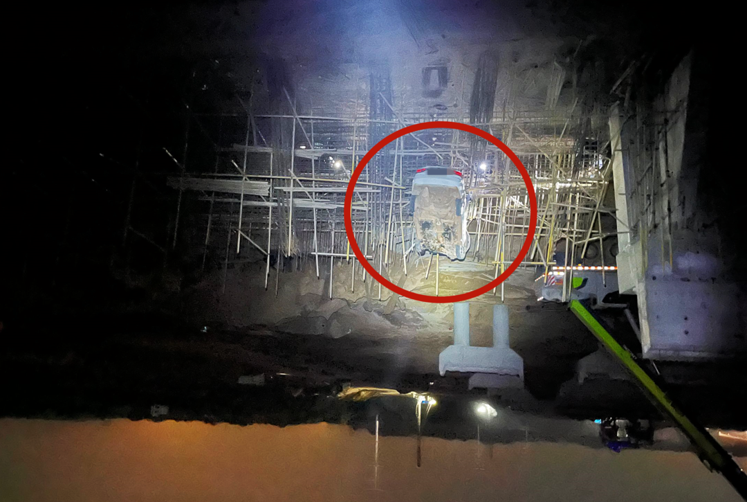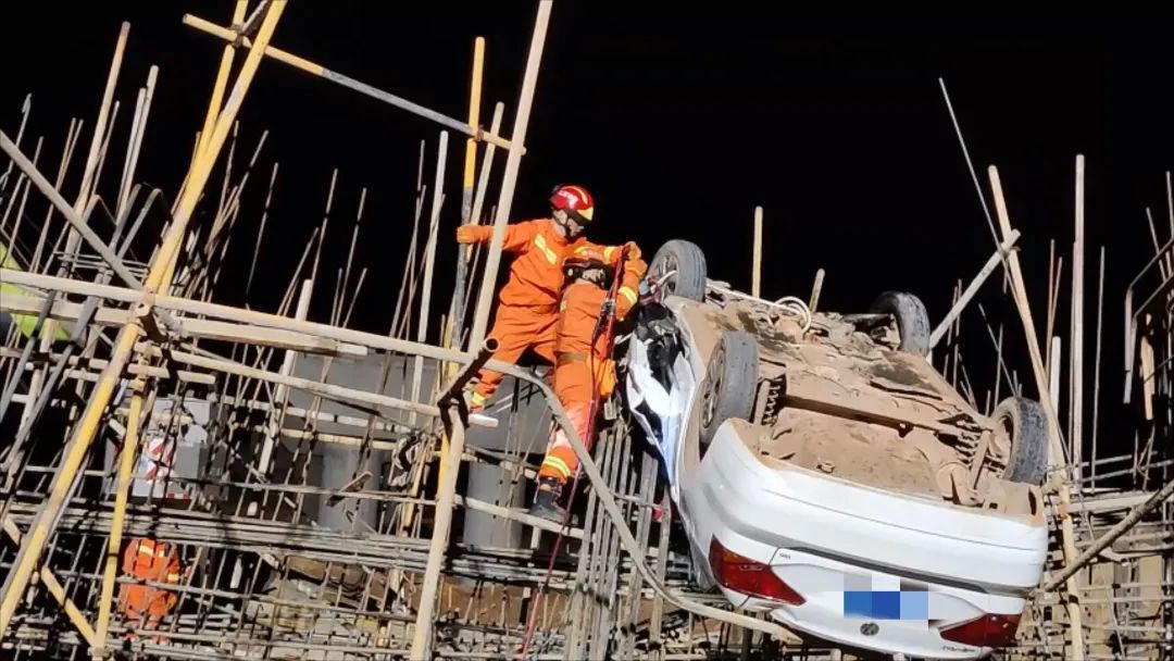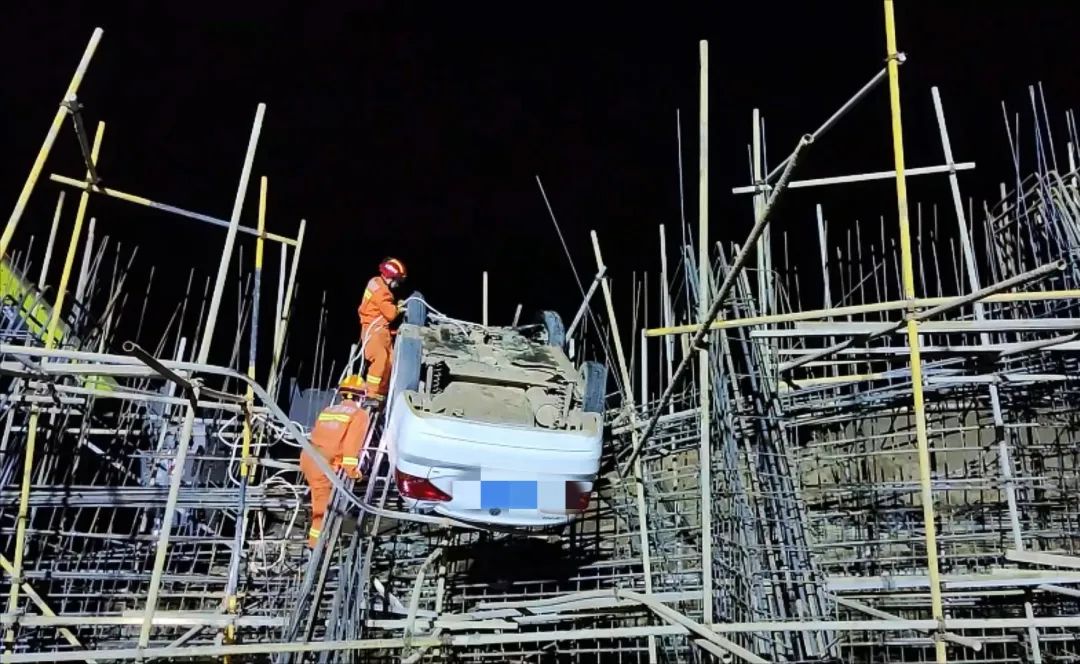消防員到場(chǎng)后,發(fā)現(xiàn)該車輛“懸?!钡奈恢?,是一處在建橋墩工地的鋼筋架,駕駛員被困車內(nèi)。