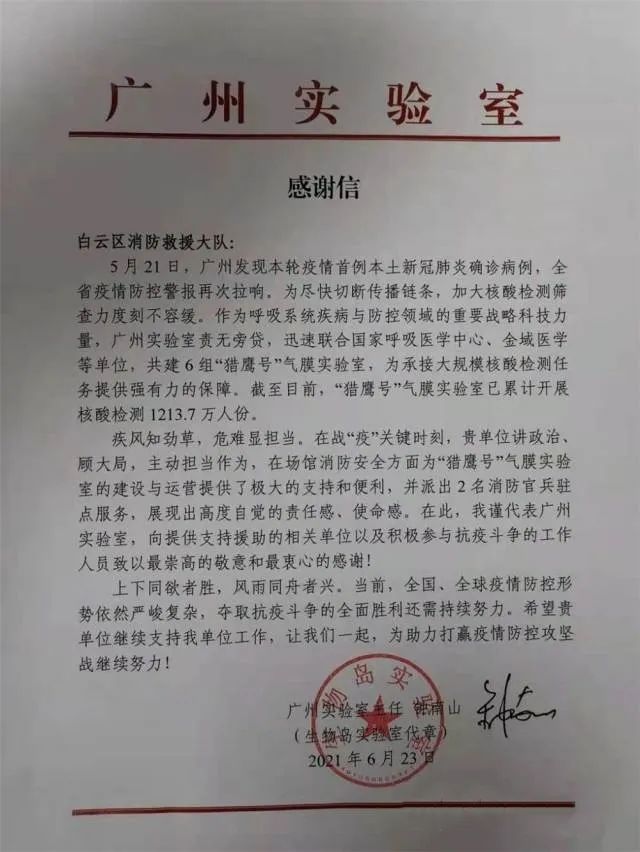 鐘南山在信中表示,白云區(qū)消防救援大隊(duì)講政治、顧大局,主動(dòng)擔(dān)當(dāng)作為,在場(chǎng)館消防安全方面,為廣州體育館“獵鷹號(hào)”氣膜實(shí)驗(yàn)室的建設(shè)與運(yùn)營(yíng),提供了極大的支持和便利,特此表達(dá)最崇高的敬意和最衷心的感謝。