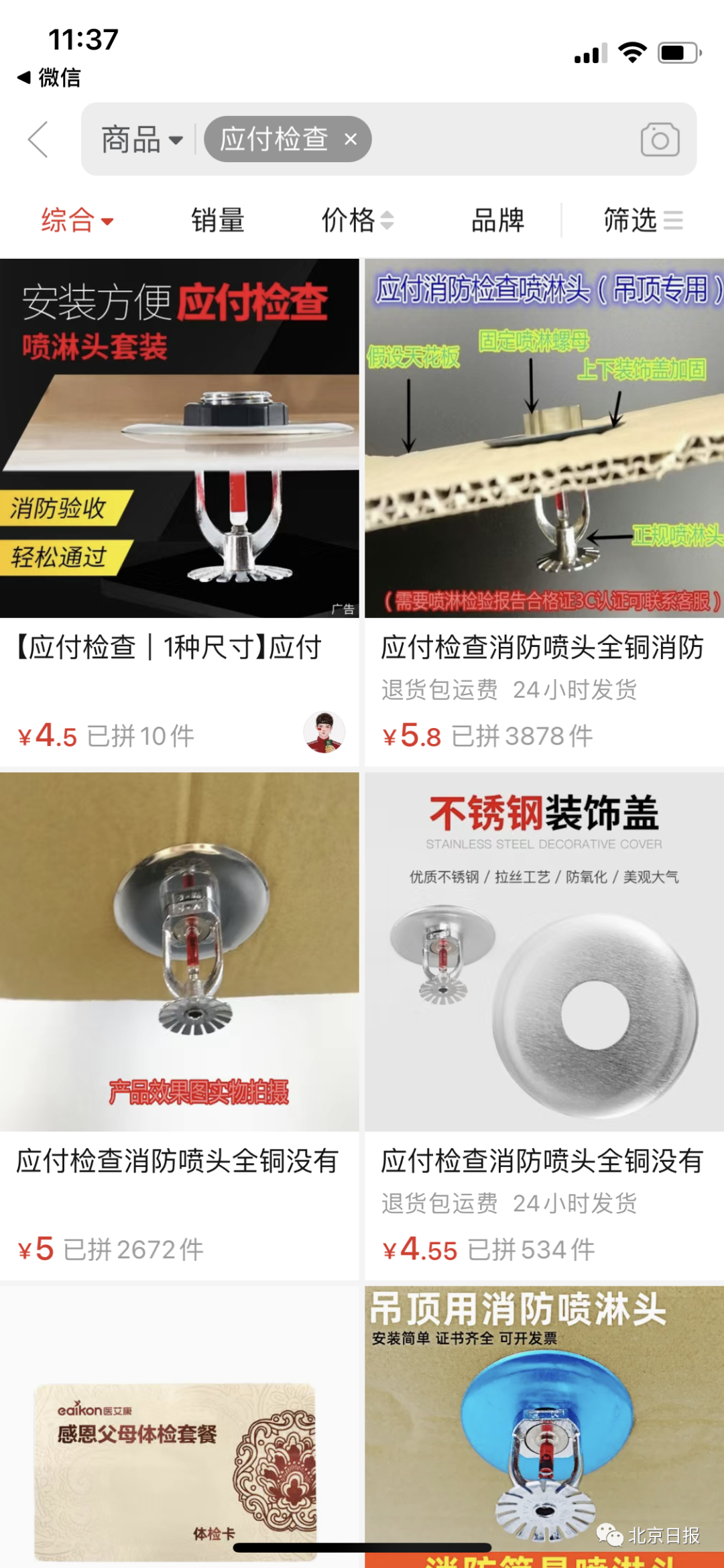 點(diǎn)開一家顯示“已拼1.4萬件”的,商品詳情頁看到,除商品名稱外,商品介紹的圖片中赫然寫著,“應(yīng)付檢查消防噴頭” 8個(gè)大字。