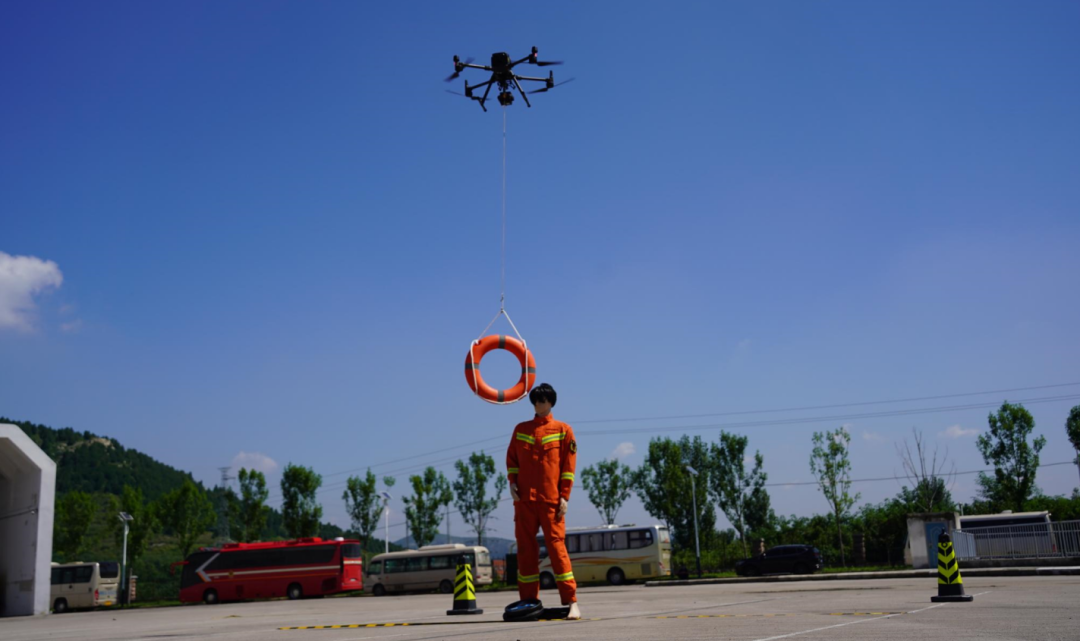 將救生圈掛至無人機拋投掛鉤,把救生圈套入假人頭部。