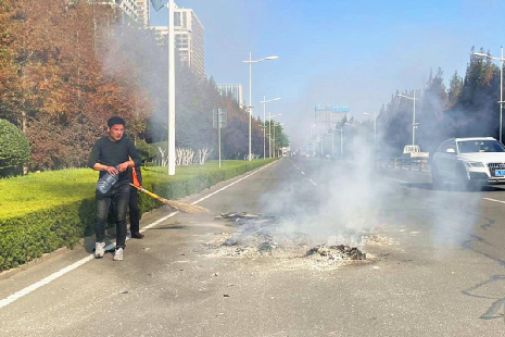為防止車輛因著火發(fā)生爆炸,孫嚴將貨車車斗中燃燒的密度板和紙箱卸至主路面燃燒。 在火災撲滅后,他又第一時間組織環(huán)衛(wèi)保潔人員對路面污漬進行清理刷洗,恢復道路整潔。
