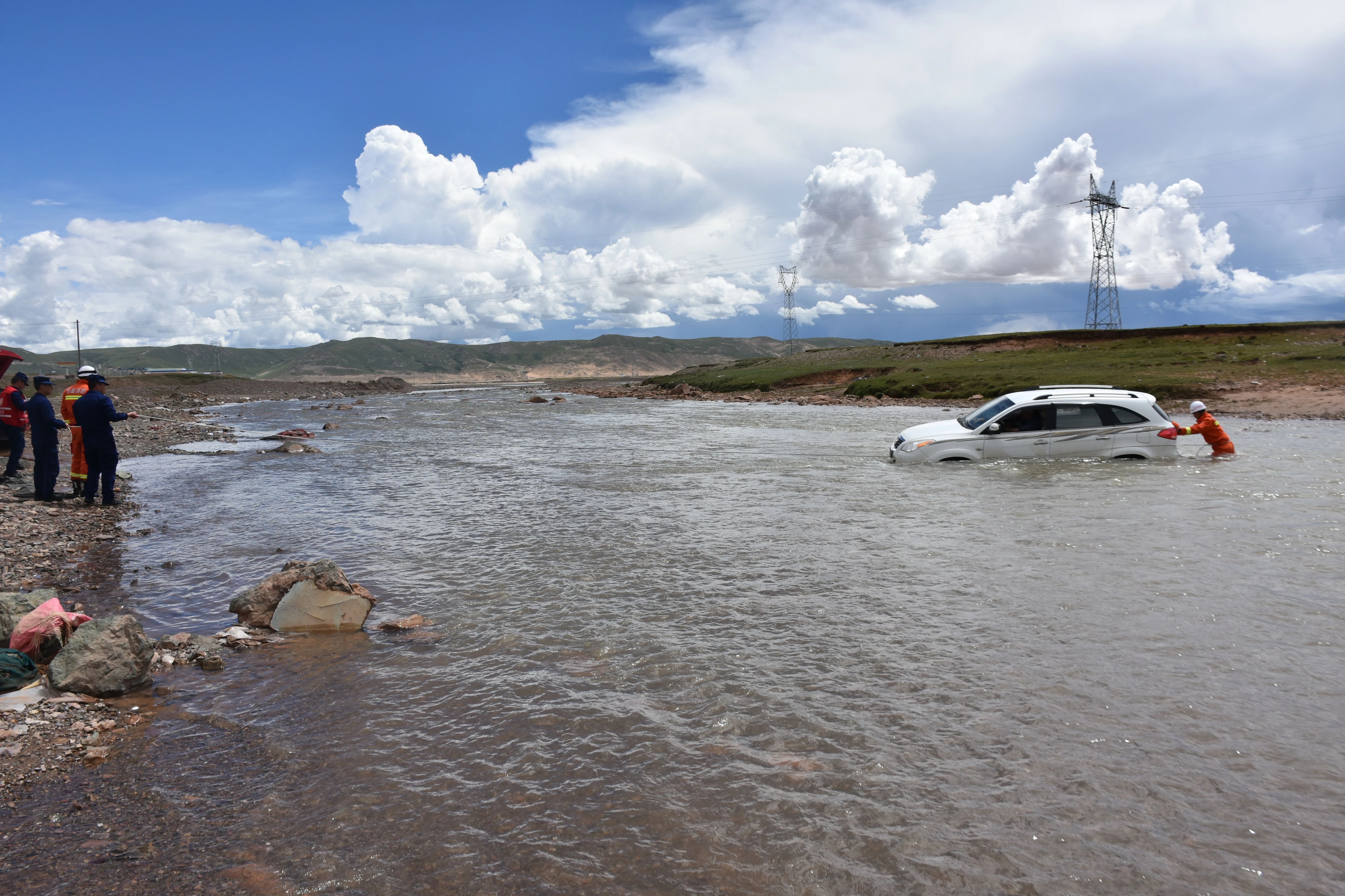 2019年10月22 日凌晨,一輛勇士越野車不慎掉入安多河,約2噸重的車子硬是被湍急的水流沖到了河中央,車上5名人員奮力自救,從車窗爬出來后,站在車頂上大聲呼救。