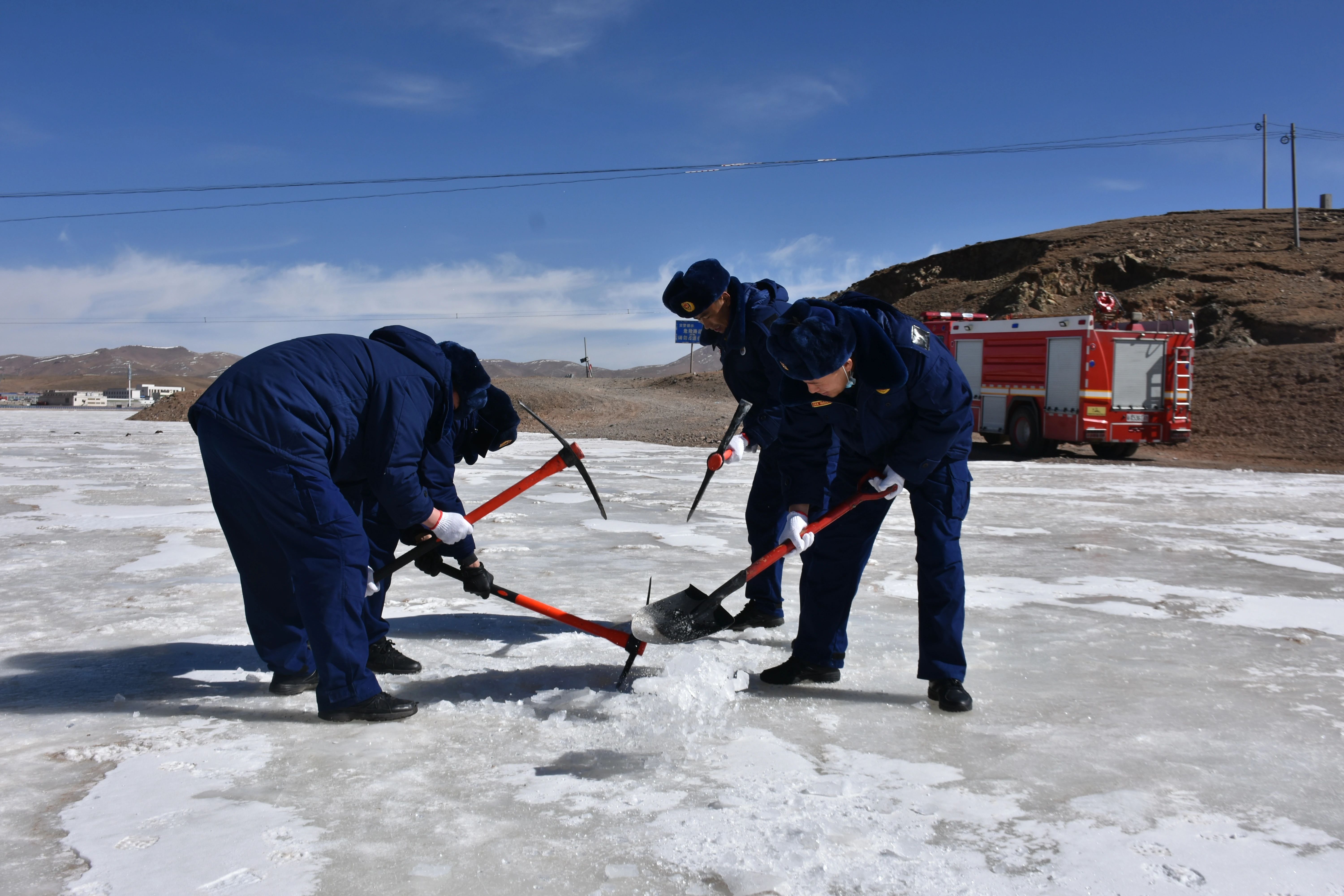 水是滅水是滅火作戰(zhàn)的必備物資,能否保持不間斷供水,是決定消防救援隊伍滅火救援成敗的關(guān)鍵。然而,受高原極寒氣候影響,每年9月至來年5月,長達9個月都是安多縣的冰凍期。一到冰凍期,河流結(jié)冰,水源難尋,消防救援隊伍滅火及當?shù)厝罕娚钣盟际艿綐O大影響。為有效解決這一難題,該大隊指戰(zhàn)員在同殘酷自然環(huán)境頑強的戰(zhàn)斗中不斷探索、想方設(shè)法,成立了“鑿冰班”。