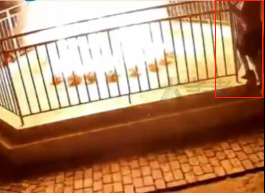 11月4日凌晨,一名戴著頭盔和口罩的女子,用汽油焚燒銀杏樹后翻墻逃離。