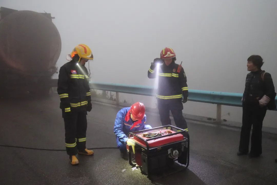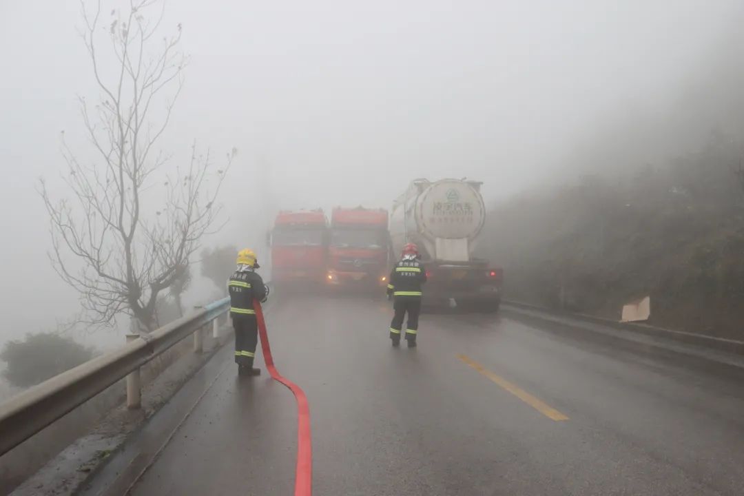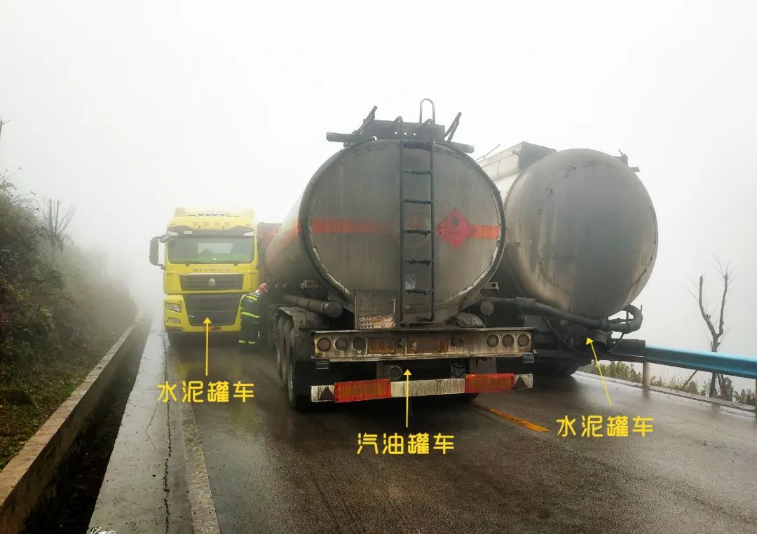 當日14時許,接到報警后,威寧縣消防救援大隊迅速出動2車8人前往處置。消防員到場后,經(jīng)偵查得知,一輛33.5噸汽油罐車的司機,因霧大未看清對面來車,在超車時被卡在了兩輛水泥罐車中間。