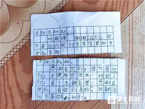 “當(dāng)時(shí)我們正在寧蒗縣永寧鎮(zhèn)八瓦村給他們家搭建帳篷,小女孩過(guò)來(lái)拉了一下我的衣角說(shuō),叔叔給。我問是什么?小女孩又重復(fù)了一遍:叔叔給?!痹颇鲜〕壑菹谰仍ш?duì)消防員何震打開紙條,上面寫著:“消防員叔叔聽我說(shuō):謝謝您們,因?yàn)橛心鷤兾覀儾抛兊酶悠桨埠兔利?.....”何震原本疲憊的身體在看到小女孩的紙條后,瞬間干勁十足。