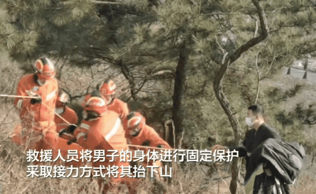 了解到被困男子身體多處骨折,無法動彈,救援人員將男子的身體進行固定保護,采取接力方式將其抬下山。