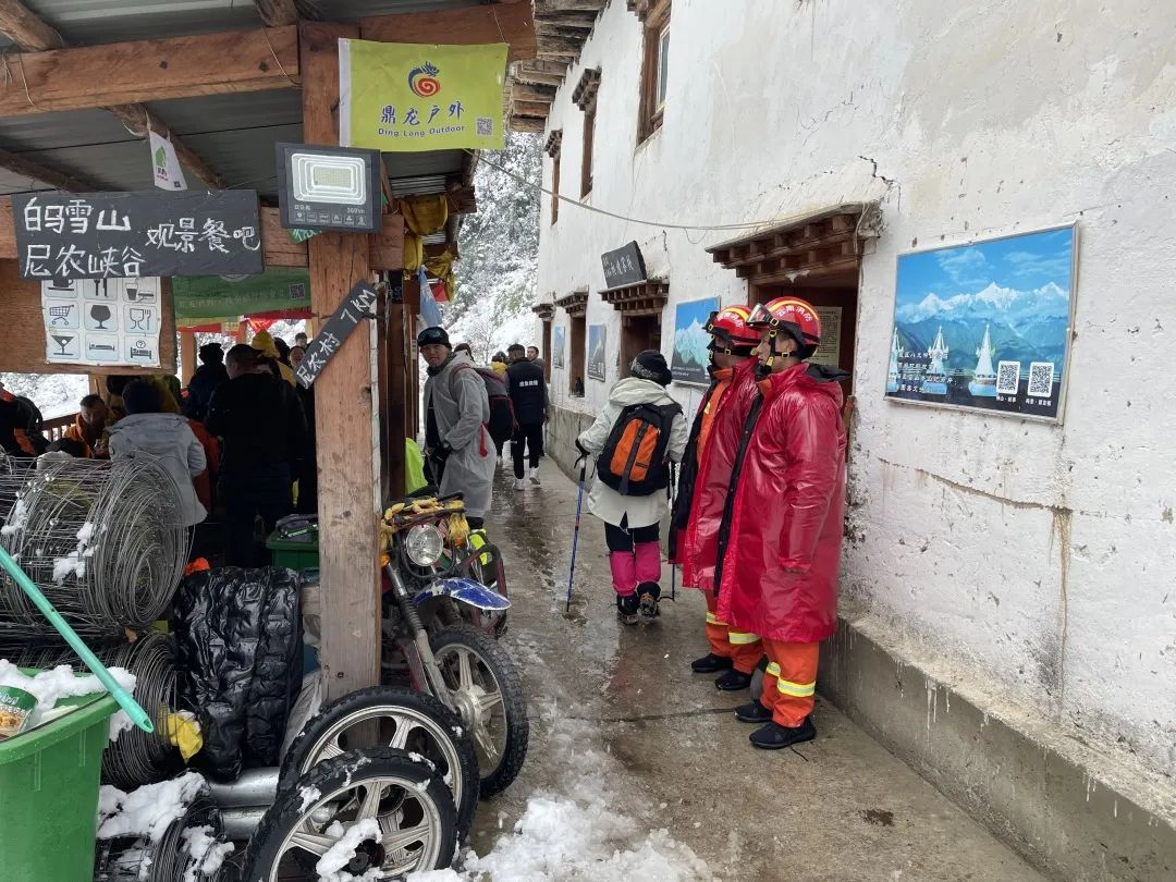 為保證游客安全,2月6日14時25分,德欽縣消防救援大隊聯(lián)合多部門,全程護(hù)送游客出雪山,整個護(hù)送行動采取分點接應(yīng)方式進(jìn)行。