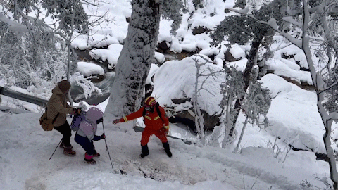 下山的過程中,一名消防救援人員負(fù)責(zé)前方探路,遇到結(jié)冰濕滑陡峭處,消防員便為游客開路,并攙扶、協(xié)助他們安全通過,另一名消防員殿后,防止游客掉隊。