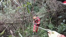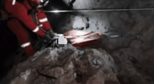 經(jīng)過40余分鐘,救援人員終于抵達(dá)洞穴底部。由于林某腰部受傷,加之被困時(shí)間較長,意識開始模糊,無法動彈。另一同伴朱某受輕傷,意識清醒。