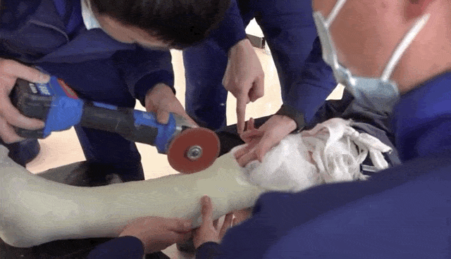 為防止切割工具的深入傷到孩子,藍(lán)朋友們隨后徒手將石膏往下掰,期間還不時(shí)詢問(wèn)小女孩會(huì)不會(huì)痛。