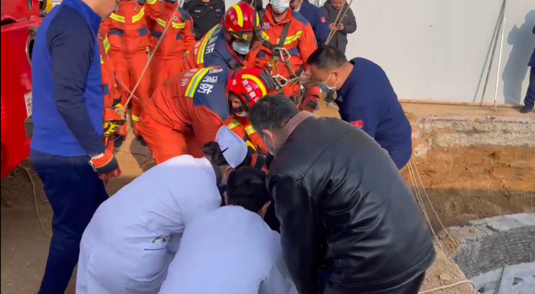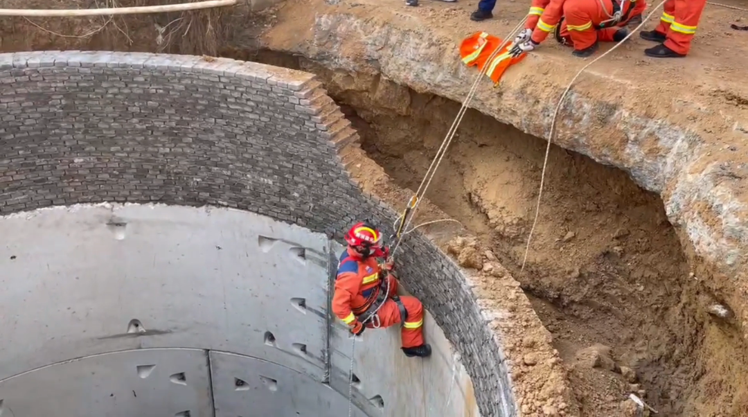 在穿戴好保護(hù)設(shè)施后,消防員利用消防車吊臂和救援繩索,下降到施工深井底部。