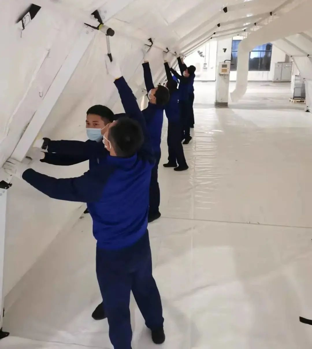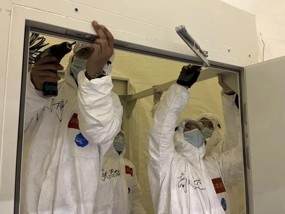 累計安裝了4組新風空調(diào)、16個生物安全柜、6個氣膜移動實驗室艙、15扇機械傳遞窗、12個帳篷、28個電箱、30個平板桌、35個物品柜、36個儲物架、120根燈管等設施,對方艙集結區(qū)恒溫系統(tǒng)、照明設施、電器線路進行了敷設。