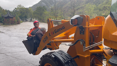 消防救援人員聯系當地政府調派一輛工程車輛到達現場,將消防救援人員運送過水淹路面順利到達被困老人家中,將被困老人放在鏟車上并做好防護措施,經一番努力,成功將老人救出。