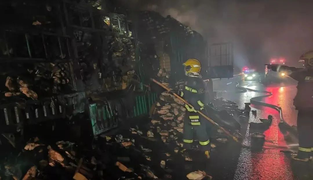3月20日凌晨3時(shí)許,陜西西安河池寨收費(fèi)站西安往漢中方向,一輛滿(mǎn)載肉制品的半掛車(chē)起火,急需救援。