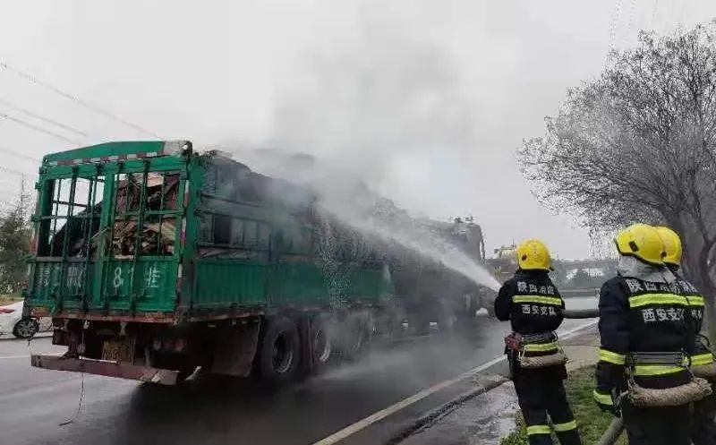 無(wú)獨(dú)有偶,同一天西安戶(hù)縣收費(fèi)站也有一半掛車(chē)著火,消防救援人員經(jīng)過(guò)20分鐘撲救,確認(rèn)無(wú)危險(xiǎn)后返回。