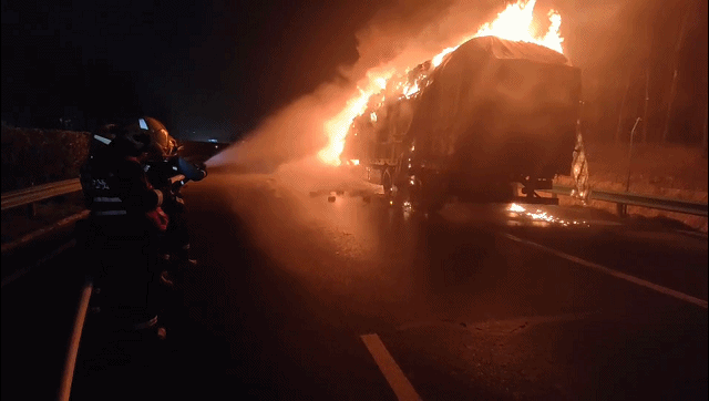 救援人員到場(chǎng)后發(fā)現(xiàn),半掛車(chē)停靠在路邊,車(chē)身被熊熊大火包圍,現(xiàn)場(chǎng)火光四射,濃煙滾滾。