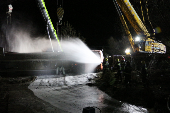 隨后,現(xiàn)場(chǎng)指揮部決定在水槍掩護(hù)下,對(duì)側(cè)翻泄漏的油罐車進(jìn)行倒灌作業(yè)。