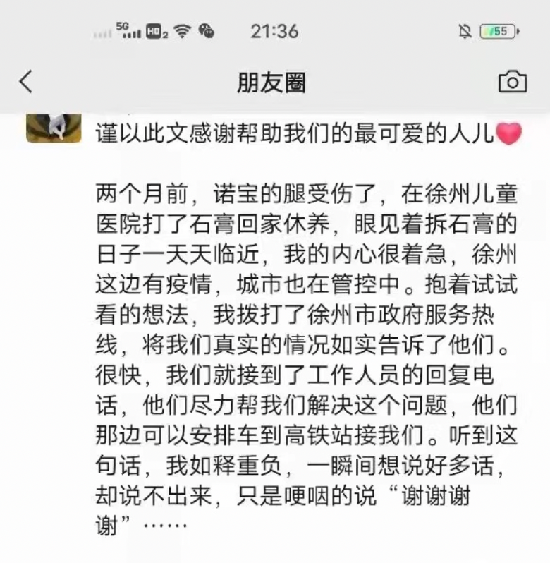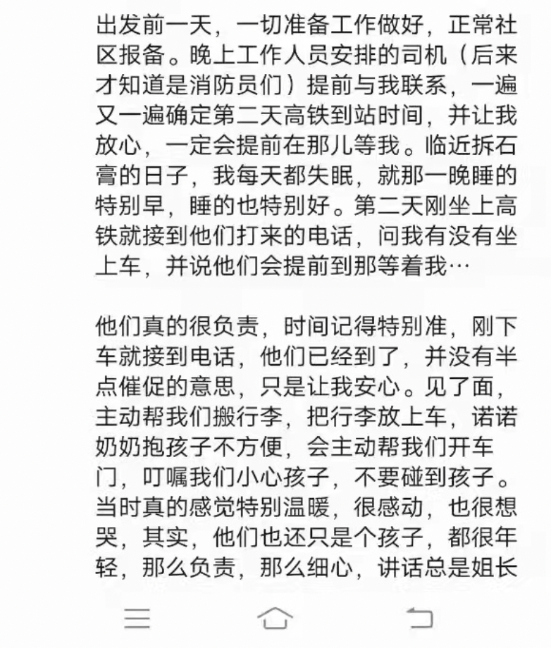 在當(dāng)天下午手術(shù)完成后,消防員又準(zhǔn)時(shí)到達(dá)兒童醫(yī)院,把祖孫三人送到高鐵站,這位淮北市民順利到家后,在微信朋友圈發(fā)了800字的長(zhǎng)文:徐州鼓樓消防大隊(duì)的消防員們,真的很感謝你們的幫助,愿你們每次執(zhí)行任務(wù)都能平平安安。愿疫情早日結(jié)束,到時(shí)候一定帶著孩子,我們?nèi)缂s再見。