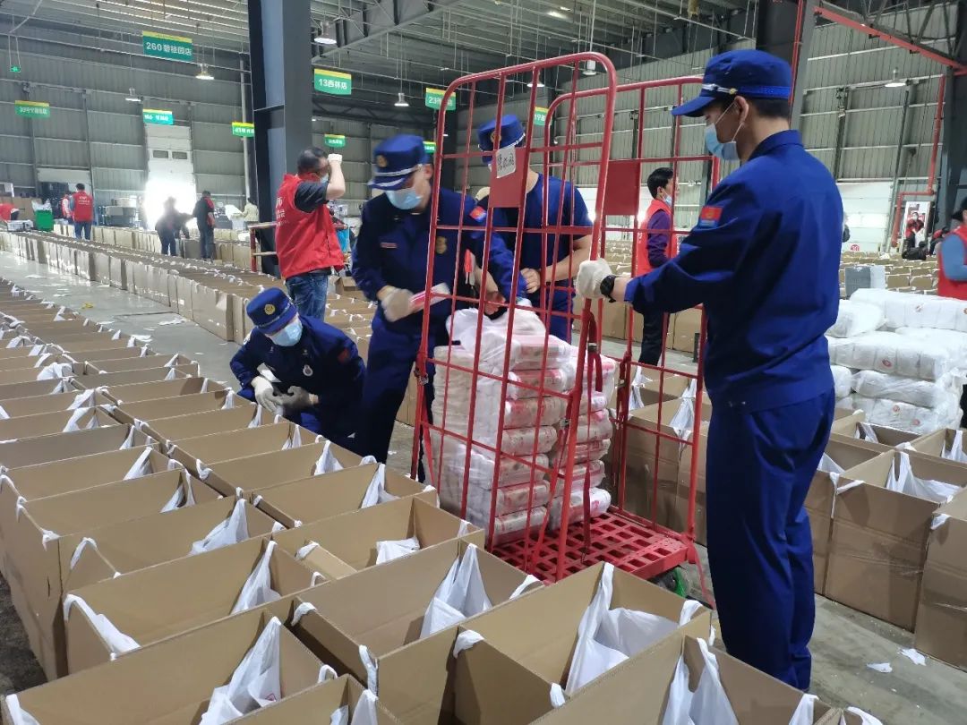安徽宣城消防抗“疫”志愿服務隊集結前往市區(qū)生鮮冷鏈配送中心,以最快速度將生活物資進行分揀、打包和登記。