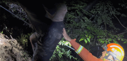 由于消防車輛無法上山,消防員攜帶救援繩索、擔(dān)架、醫(yī)療物品、照明裝備等,沿著懸崖邊,徒步找尋群眾被困位置。該區(qū)域雜草叢生、巖石陡峭,不時有石塊滾落,給冒雨救援的消防員帶來諸多困難。