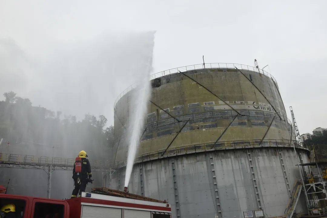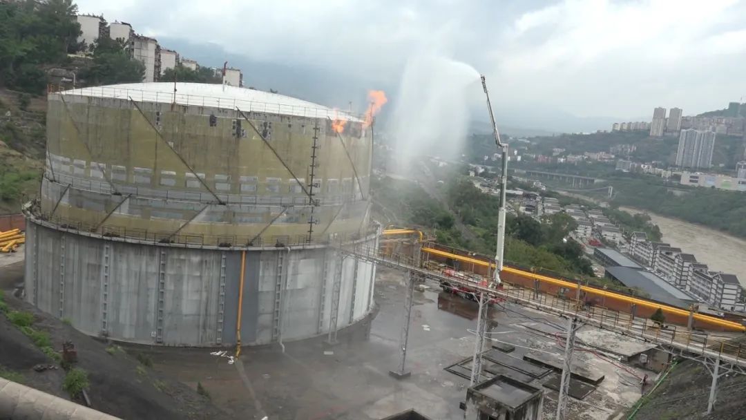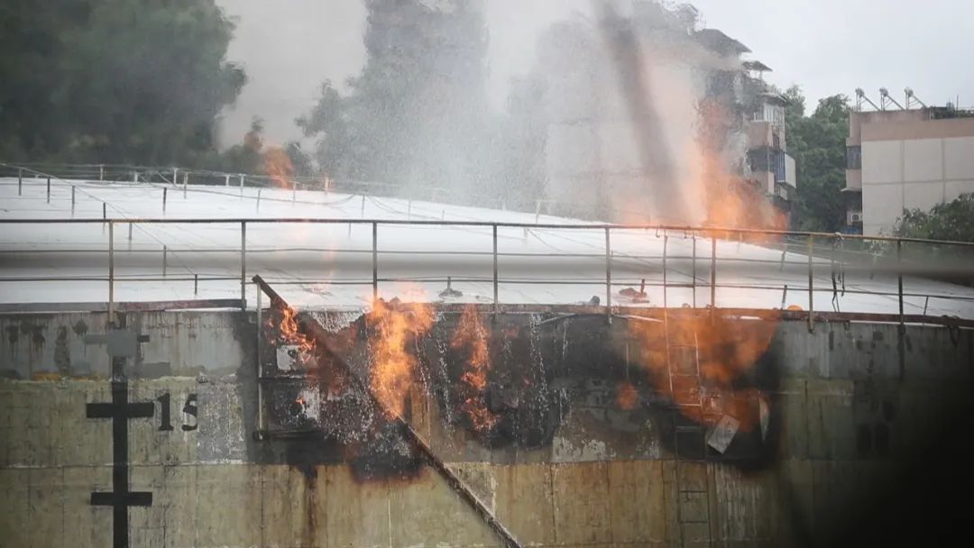 15時(shí)02分,現(xiàn)場(chǎng)安全員發(fā)現(xiàn)柜頂下落速度明顯加快且有回火風(fēng)險(xiǎn),指揮部立即組織全體人員撤離至安全位置,柜體西南方向留守一輛高噴車?yán)檬彝庀鹚ü┧?,繼續(xù)進(jìn)行冷卻。