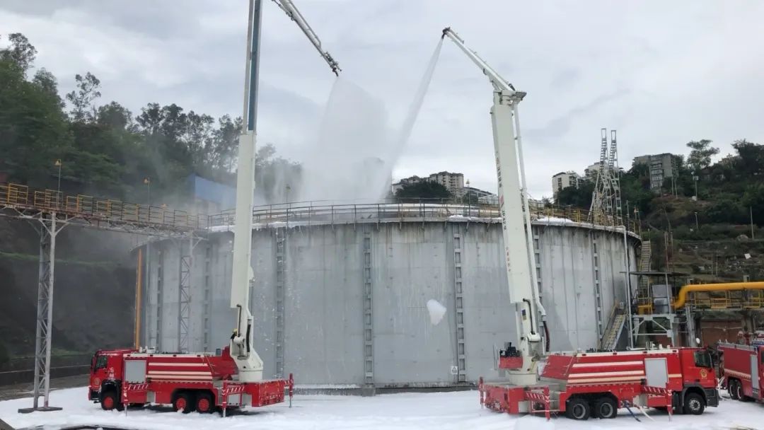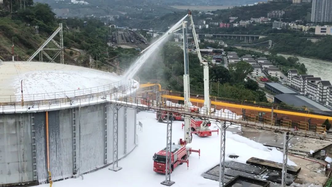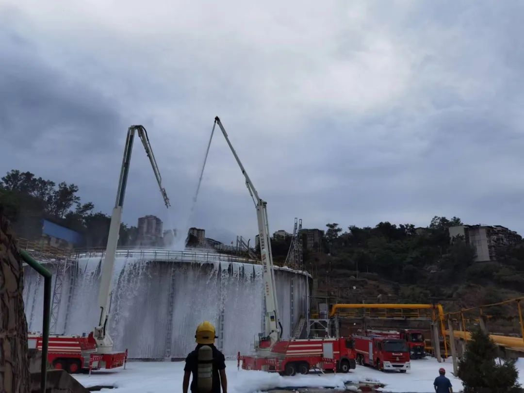 15時(shí)54分,經(jīng)現(xiàn)場(chǎng)專家技術(shù)人員評(píng)估,柜體內(nèi)燃?xì)鈮毫Τ掷m(xù)減小,火勢(shì)呈下降趨勢(shì),且未發(fā)生回火爆炸。現(xiàn)場(chǎng)指揮部會(huì)同專家商定研判,決定采取泡沫覆蓋滅火的方式準(zhǔn)備總攻。經(jīng)檢測(cè)儀測(cè)試安全后,現(xiàn)場(chǎng)指揮部及時(shí)調(diào)整力量,下令對(duì)現(xiàn)場(chǎng)發(fā)起總攻:兩輛高噴車在柜體西南方出泡沫對(duì)燃燒口進(jìn)行切封滅火。
