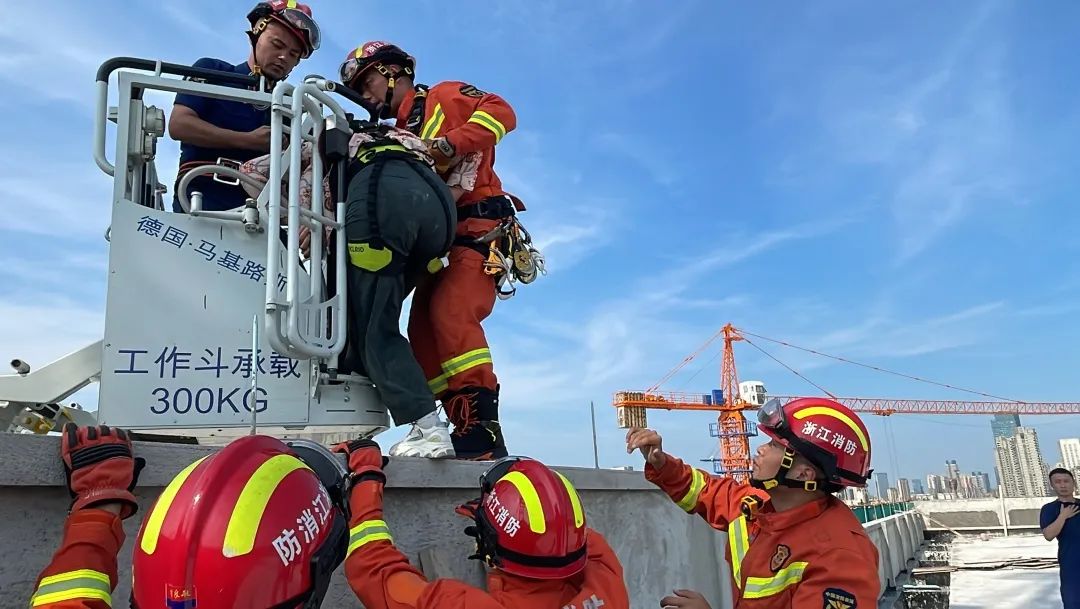 6月25日下午,浙江湖州。一建設工地上,有人中暑暈倒在60米的塔吊上。消防員接警后立即出動。