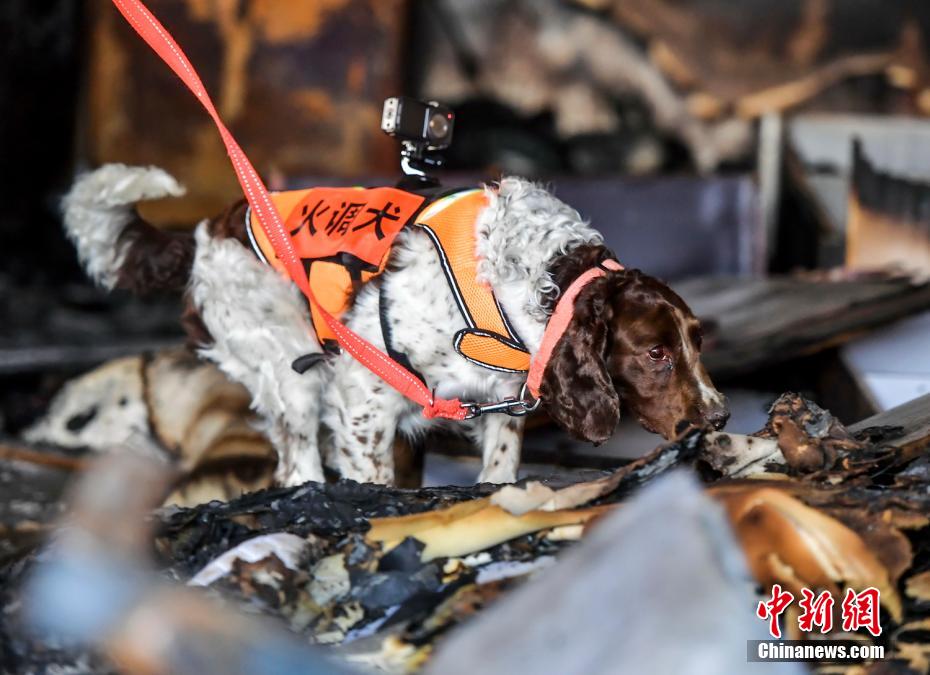 一只經(jīng)過嚴格訓練的火調(diào)犬在“火災”現(xiàn)場搜索特殊氣體殘留痕跡。 劉新 攝