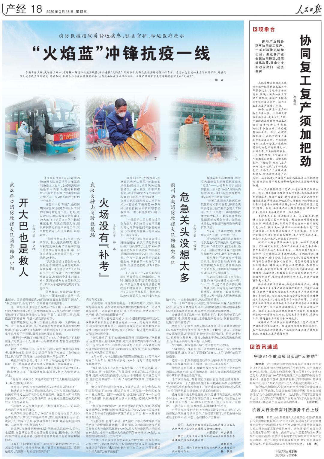 2020年03月18日,《人民日?qǐng)?bào)》18版刊發(fā)《“火焰藍(lán)”沖鋒抗疫一線:消防救援指戰(zhàn)員轉(zhuǎn)送病患、駐點(diǎn)守護(hù)、轉(zhuǎn)運(yùn)醫(yī)療廢水》,內(nèi)容如下: