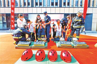 每天增加體育課、課后服務分時段規(guī)劃、探索“分層作業(yè)”……進入新學期,全市各中小學都有不少新變化。昨日是開學第一天,北京青年報記者結(jié)合“雙減”舉措入校走訪。不久前出臺的“雙減”措施中,“素質(zhì)”一詞無疑成為關(guān)鍵詞?!半p減”中的素質(zhì)不僅體現(xiàn)在課后的“素質(zhì)教育”課程數(shù)量超課后服務內(nèi)容的半數(shù),還體現(xiàn)在校內(nèi)課程的講授形式和方法上更科學、更符合學生特點。圖為北京二中經(jīng)開校區(qū)迎接一年級新生,消防安全成為開學第一課。攝影/本報記者 付丁