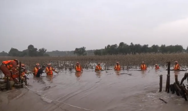 10月7日13時(shí)許,剛完成一次救援任務(wù)的平遙消防指戰(zhàn)員返程途中接到命令 :香樂(lè)鄉(xiāng)磁窯河發(fā)生決堤,立即派人執(zhí)行封堵決口任務(wù)。沒(méi)有來(lái)得及補(bǔ)上“晚點(diǎn)”的午飯,52名消防指戰(zhàn)員直奔磁窯河決口現(xiàn)場(chǎng)。磁窯河決口的直線長(zhǎng)度約10米,封堵方案為先打樁再填沙袋。搶險(xiǎn)物資無(wú)法直接運(yùn)到對(duì)岸,消防指戰(zhàn)員跳進(jìn)洪水排成長(zhǎng)隊(duì)傳遞物資;扶樁、填沙袋,仍舊需要他們跳進(jìn)洪水 。