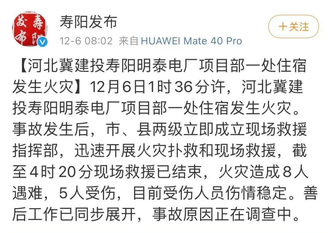 據(jù)壽陽發(fā)布消息,12月6日1時(shí)36分許,河北冀建投壽陽明泰電廠項(xiàng)目部一處住宿發(fā)生火災(zāi)。事故發(fā)生后,市、縣兩級立即成立現(xiàn)場救援指揮部,迅速開展火災(zāi)撲救和現(xiàn)場救援,截至4時(shí)20分現(xiàn)場救援已結(jié)束,火災(zāi)造成8人遇難,5人受傷,目前受傷人員傷情穩(wěn)定。善后工作已同步展開,事故原因正在調(diào)查中。