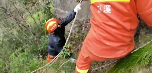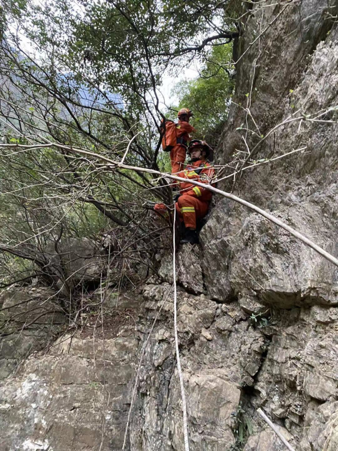 下山撤退途中,兩名消防指戰(zhàn)員手拿柴刀,在坡度約70多度的山上開路,其他消防指戰(zhàn)員為被救測(cè)繪員做好保護(hù)。中途有多處垂直陡峭區(qū)域,非常危險(xiǎn)。消防指戰(zhàn)員使用攜帶的繩索等裝備,搭建安全通道,給測(cè)繪員套上腰結(jié),緩慢通過(guò)危險(xiǎn)區(qū)域。全部人員于中午12點(diǎn)成功撤退至山腳安全地帶。