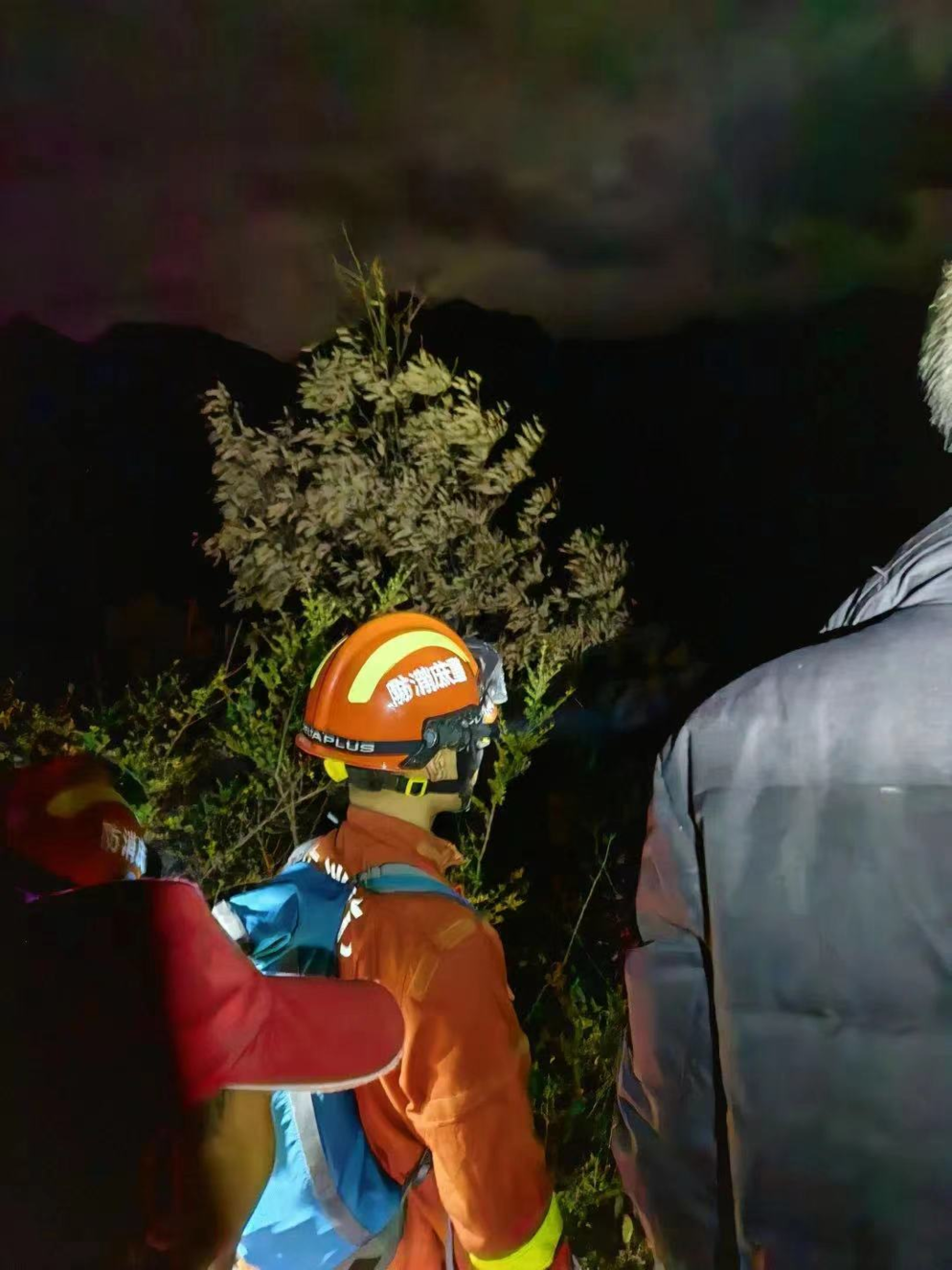 19時(shí)06分,救援力量到達(dá)現(xiàn)場(chǎng)。經(jīng)詢問(wèn)了解到,回頭廟山海拔約1000米。救援人員與被困測(cè)繪員聯(lián)系后,確定其大概位置在半山腰附近。救援人員組成四人攻堅(jiān)小組,攜帶照明、防寒保暖物資和食物,在兩名向?qū)У膸ьI(lǐng)下上山搜救。