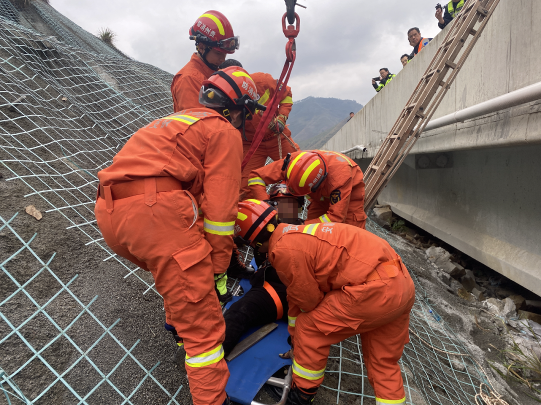 到達(dá)現(xiàn)場(chǎng)后,消防救援人員發(fā)現(xiàn)男子躺在橋下的斜坡上,動(dòng)彈不得,被困位置距離橋面高度約5米。男子意識(shí)清醒,只是右腿受傷,無法行動(dòng)。