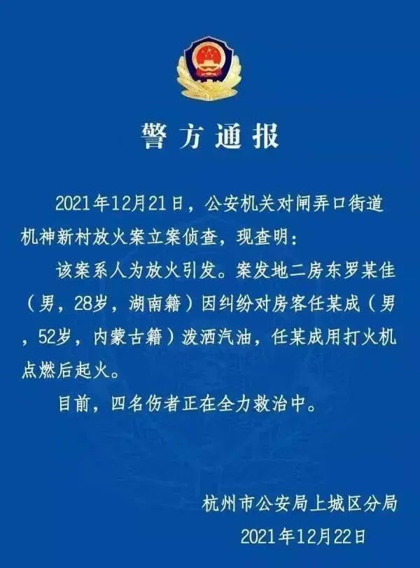 12月21日,浙江杭州上城區(qū)某小區(qū)發(fā)生火災(zāi),致1死4傷。22日晚,杭州市公安局上城區(qū)分局發(fā)布警方通報(bào),查明該案系人為放火引發(fā)。經(jīng)查,著火房屋二房東羅某佳(男,28歲,湖南籍)因糾紛對(duì)房客任某成(男,52歲,內(nèi)蒙古籍)潑灑汽油,任某成用打火機(jī)點(diǎn)燃后起火。目前,4名傷者正在全力救治中。