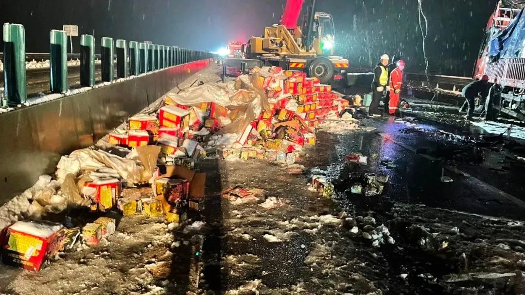 當天凌晨0點56分,消防救援人員到達事故現場后發(fā)現,事故車輛為一輛裝載17噸煙花的掛車。