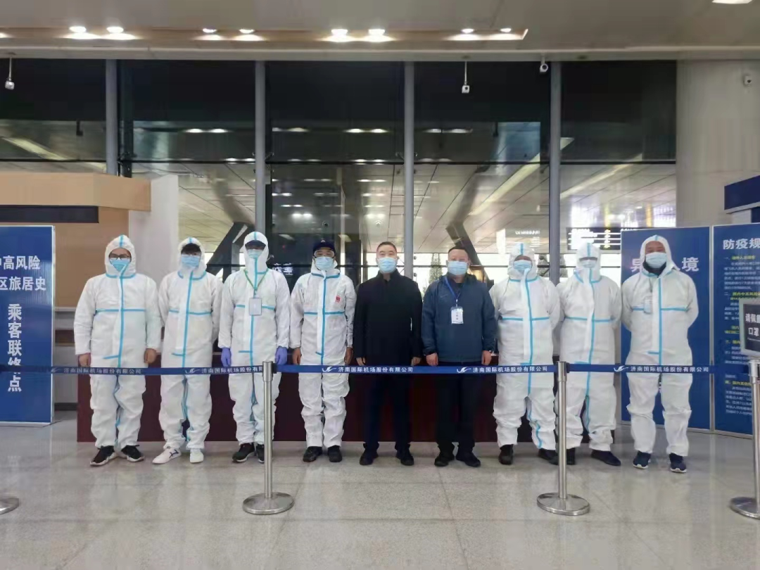 山東省濟(jì)南市消防救援支隊高新區(qū)消防救援大隊派出防疫小組,增援濟(jì)南遙墻機(jī)場。實行24小時全天候值班值守,對每一位轉(zhuǎn)運人員測量體溫和行李消毒。