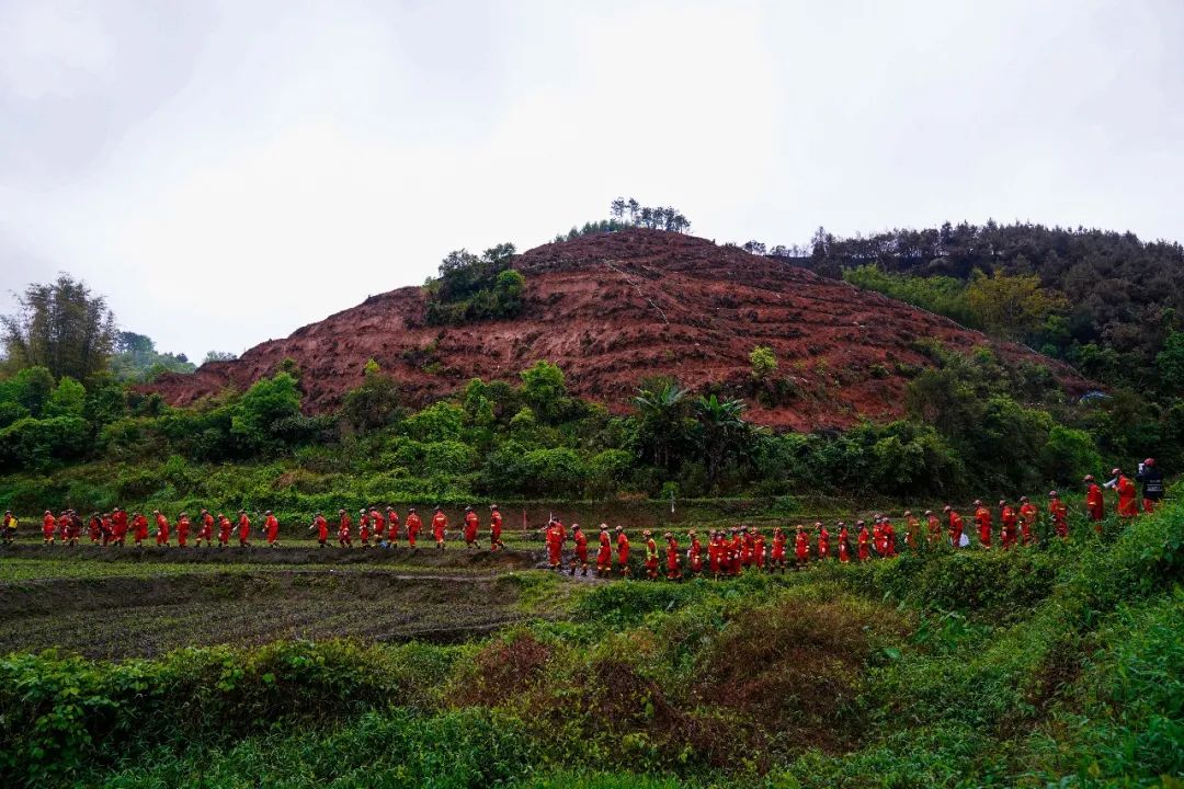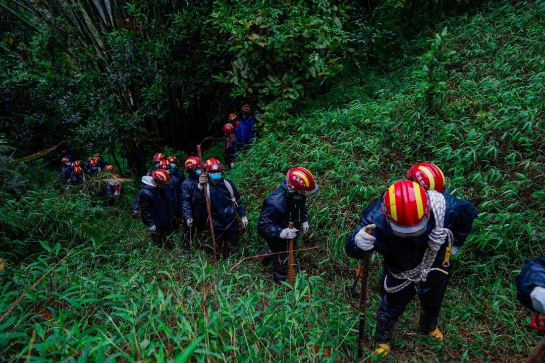 隊長將搜救區(qū)域劃分網(wǎng)格、編組作業(yè)、輪番上陣,我們一組六人編為繩索專業(yè)隊,專門攻堅陡峭難上的坡地。我們翻著一座一座山尋找著生還者,山坡兇險陡峭,雜草叢生,部分坡地和水平面成70度角,較難攀爬,我和隊友始終都沒有放棄,走不通的路,我們就在附近樹干上打個支點,另一頭結繩而下,一寸一寸搜遍所有區(qū)域。黑夜來臨,我們拿出了移動照明燈組、手提式強光照明燈,隊友們相互協(xié)作,共同配合,整座山頭被星星點點的燈光照得發(fā)亮。