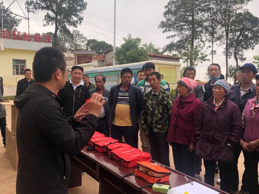 云南省昆明市應(yīng)急管理局的黨員干部向村民講解“云南白藥小應(yīng)急包”的使用方法和注意事項(xiàng)