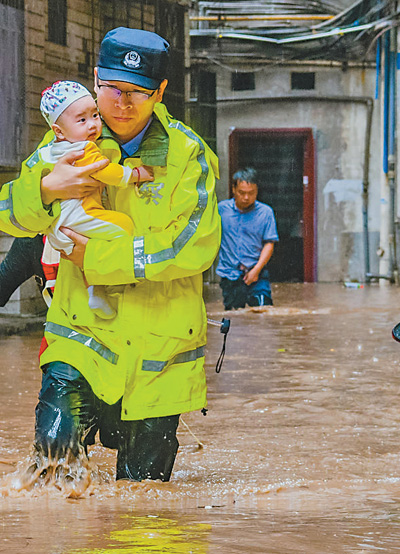 6月22日,重慶綦江區(qū)北街居民樓被淹,警察正在轉(zhuǎn)移被困群眾。