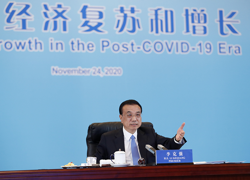 國(guó)務(wù)院總理李克強(qiáng)11月24日晚在釣魚臺(tái)國(guó)賓館同世界銀行行長(zhǎng)馬爾帕斯、國(guó)際貨幣基金組織總裁格奧爾基耶娃、世界貿(mào)易組織副總干事沃爾夫、國(guó)際勞工組織總干事萊德、經(jīng)濟(jì)合作與發(fā)展組織秘書長(zhǎng)古里亞和金融穩(wěn)定理事會(huì)主席夸爾斯舉行第五次“1+6”圓桌對(duì)話會(huì)。會(huì)議以視頻方式舉行,圍繞“促進(jìn)后疫情時(shí)代的世界經(jīng)濟(jì)復(fù)蘇和增長(zhǎng)”主題,就世界經(jīng)濟(jì)形勢(shì)、中國(guó)經(jīng)濟(jì)形勢(shì)以及后疫情全球經(jīng)濟(jì)治理等議題深入交流。