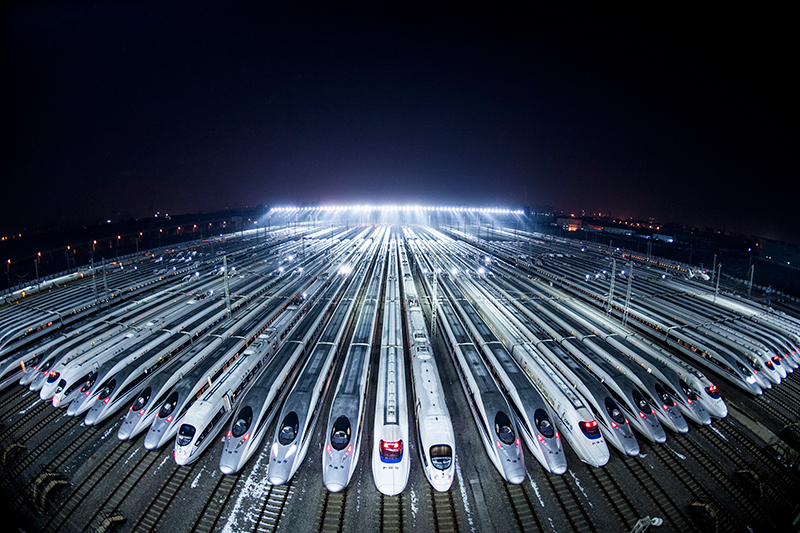 動車組??吭谖錆h動車段的存車線上,準備進行檢修和保溫作業(yè)(2018年2月1日攝)。新華社記者 肖藝九 攝