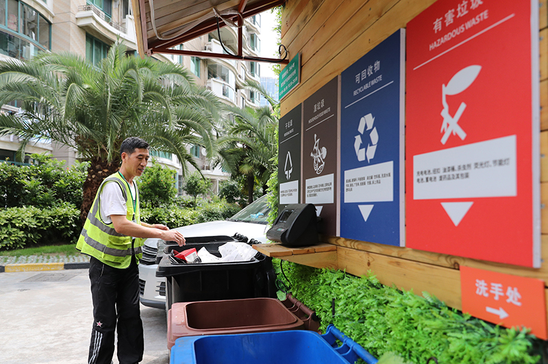 在上海市虹口區(qū)嘉興路街道一處小區(qū),保潔工對居民分類投放的生活垃圾進行分揀(2019年6月24日攝)。新華社記者 方喆 攝