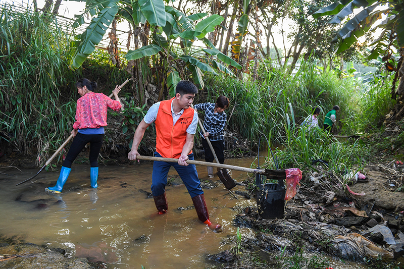 2020年5月2日,廣西興業(yè)縣小平山鎮(zhèn)金華村駐村第一書記董積有(左二)與村民一起清理河道中的淤泥和垃圾。新華社記者 曹祎銘 攝